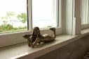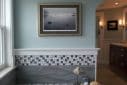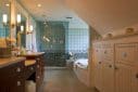 The light in New England is soft and often feels just a bit out of focus and dreamy. A subdued palate of soft blues and grays helped capture the vibe. Texture brought the vibe to life with the use of a mixture of glass, mosaic, marble and laser cut stone wainscot. The stone ripples are reflective of the water just beyond the home. We moved and added windows to allow a bather to actually enjoy the beautiful view outside. We were able to re-use the original cherry vanity cabinets but broke them apart to interrupt the level of vanity with a make-up table in the middle. We added sconces to the vanity mirrors and, at right, deep cabinets to fill the void space under the slope of the roof.